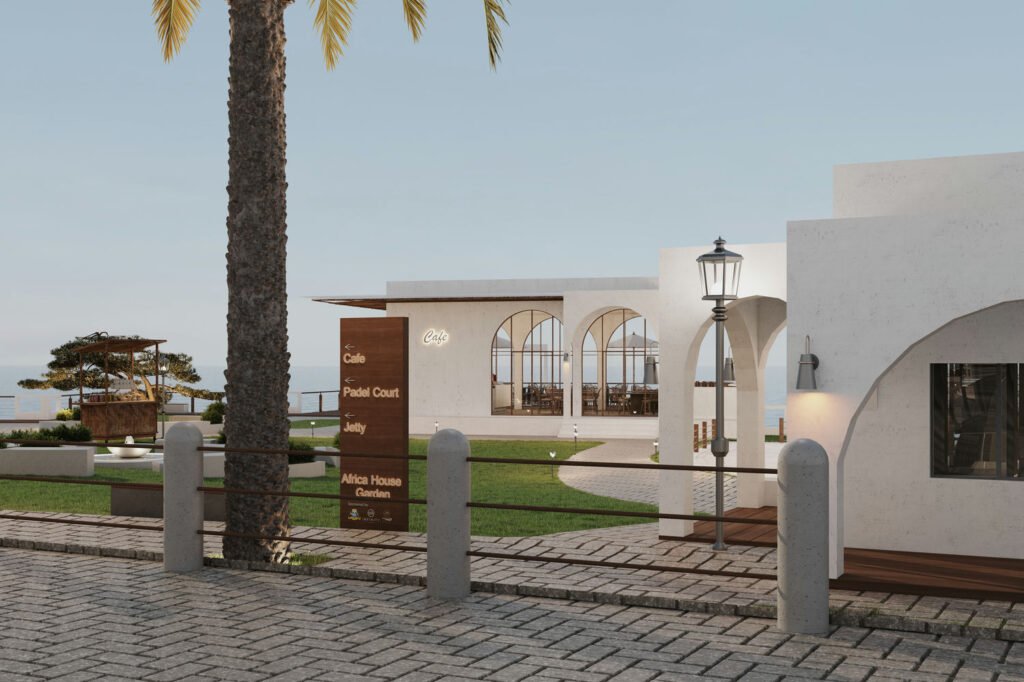 Set beside the historic Africa House Hotel, the development combines landscaped gardens, restaurants, play areas and a timber jetty that extends into the Indian Ocean.